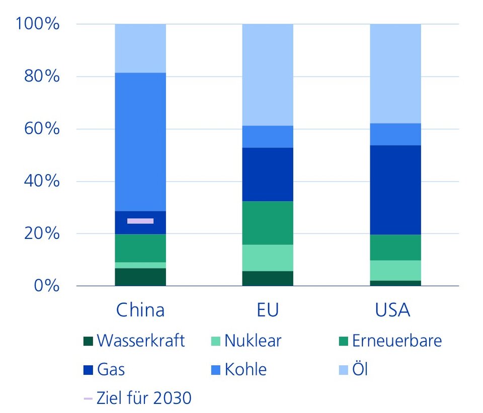 Relative Anteile am Energieverbrauch und Chinas Ziel für nicht-fossile Energiequellen bis 2030