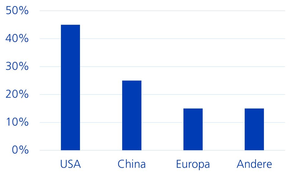 Der Anstieg der Elektrizitätsnachfrage hat seine Ursache in einer Zunahme von elektronisch betriebenen Technologien, oft auch unter dem Schlagwort Elektrifizierung zusammengefasst. So wird etwa für die Mobilität über E-Autos und das Heizen, beispielsweise über Wärmepumpen, vermehrt auf Strom statt auf fossile Energieträger zurückgegriffen. Angetrieben wird diese Entwicklung durch günstigen, mit erneuerbaren Energien produzierten Strom. Die IEA schätzt, dass die mit Abstand grösste Zunahme des Elektrizitätsbedarfs bis 2030 von der Industrie getrieben ist. Nur etwa halb so gross wird die Zunahme durch Elektromobilität sein, dicht gefolgt von elektrischen Geräten und Klimaanlagen. An fünfter Stelle rangiert die Stromnachfrage von Datenzentren. Diese machen zwar nur 1.5 Prozent der weltweiten Stromnachfrage aus, aber ihr Bedarf wächst gemäss Schätzungen bis 2030 jährlich um 15 Prozent, also viermal schneller als die allgemeine Elektrizitätsnachfrage. Obwohl cloudbasierte Anwendungen schon vor 2017 zu einer Zunahme an Rechenzentren geführt hatten, blieb der Strombedarf damals dank Effizienzerhöhungen konstant. Neue Rechenzentren für künstliche Intelligenz werden jedoch mit deutlich leistungsstärkeren Halbleitern und Kühlsystemen ausgetattet, die mehr Strom benötigen. Der Elektrizitätsbedarf für Rechenzentren variiert dabei auf regionaler Ebene stark. In den USA lösten die hohen Investitionen in Rechenzentren Sorgen über einen explodierenden Strombedarf aus. Tatsächlich benötigen die USA heute durch ihre vergleichsweise hohe Dichte an Rechenzentren weltweit am meisten Strom (vgl. Grafik). Etwa die Hälfte des US-Nachfragewachstums von Strom bis 2030 fällt auf die Rechenzentren zurück.