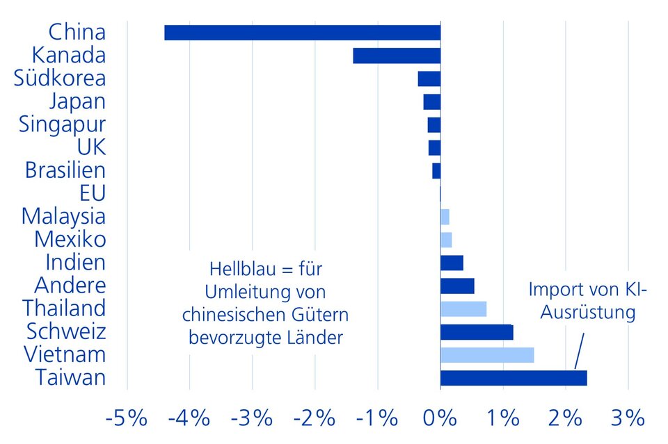 Das zentrale Versprechen des Liberation Day war die Rückkehr der Produktion in die USA («Reshoring»). Ein Jahr später zeigt sich jedoch, dass die Realität eher einer Reallokation gleicht. Anstatt die Produktion zurück in die USA zu verlagern, haben US-Unternehmen ihre Bezugsquellen von Ländern mit hoher Zollbelastung zu solchen mit niedrigeren Zöllen verschoben. Dies belegen Untersuchungen, insbesondere in Bezug auf die Importe aus China (vgl. Grafik). Dieses Verhalten verdeutlicht die Grenzen der Zollpolitik: Solange die Lohn- und Produktionskostendifferenzen zwischen den USA und Schwellenländern signifikant bleiben, ziehen Unternehmen eine Verlagerung innerhalb des Auslands einer Rückkehr in die Hochkostenregion USA vor. Zudem schreckte die hohe Unsicherheit über die Dauerhaftigkeit der Zölle US-Unternehmen vor milliardenschweren Investitionen in neue Fabriken ab, da diese oft Jahrzehnte zur Amortisation benötigen.