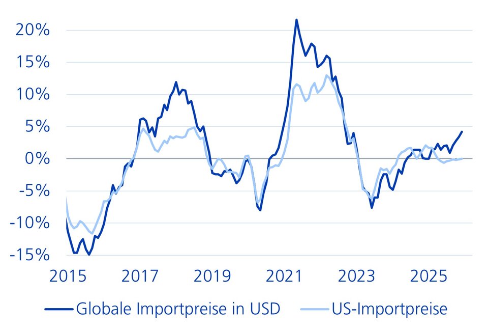 Die empirische Evidenz aus den Jahren 2018 und 2025 zeigt, dass die amerikanischen Unternehmen und Konsumenten den Grossteil der Zolllast selbst tragen. Es gibt jedoch Hinweise darauf, dass 2025 vereinzelt auch die ausländischen Hersteller Preiszugeständnisse gemacht haben. So sind die US-Importpreise weniger stark gestiegen als die weltweiten Importpreise in Dollar, was preisliche Zugeständnisse von rund 3 Prozent impliziert (vgl. Grafik). Einige ausländische Hersteller haben möglicherweise aufgrund der Zölle darauf verzichtet, allgemeinere Kostensteigerungen an US-Kunden weiterzugeben. Aus den US-Importpreisdaten stechen vor allem die Automobilhersteller heraus. Sie senkten proaktiv die Preise, um die Zollweitergabe an die Kunden zu begrenzen. Die Differenz zwischen den US-Import- und -Exportpreisen deutet darauf hin, dass die ausländischen Hersteller Rabatte in Höhe von 6 Prozent gewährten, um konkurrenzfähig zu bleiben. Preisnachlässe im Rahmen von 10 Prozent waren zudem bei alkoholischen Getränken zu beobachten. Der Zeitpunkt des plötzlichen Rückgangs der Importpreise deutet hier darauf hin, dass die Hersteller auf die Zölle reagiert haben.