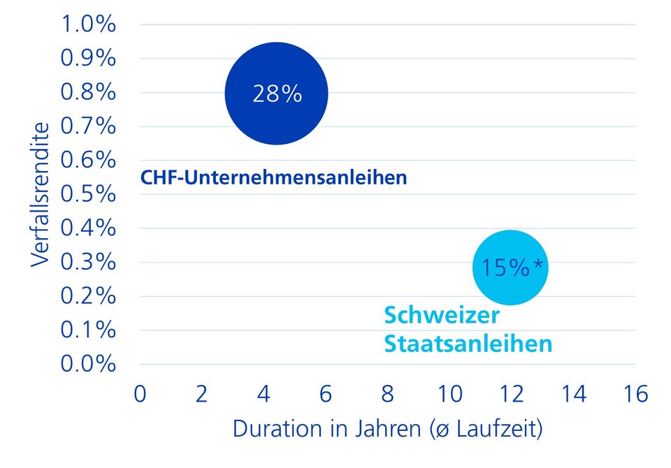 Trotz Nullzinsen kann im Schweizer Obligationenmarkt durch die Übernahme höherer Kreditrisiken eine Mehrrendite erzielt werden. Wir erachten in Franken denominerte Unternehmensanleihen als eine attraktive, strukturelle Beimischung im Portfolio, sie können im Tiefzinsumfeld einen wertvollen Beitrag zur Lösung des Anlagenotstands leisten. Zudem verfügen Schweizer Unternehmensanleihen aufgrund der stabilen Schuldner und der kürzeren Duration meistens über tiefere Kursschwankungen als Schweizer Staatsanleihen. Nicht zuletzt stellen Unternehmensanleihen einen beträchtlichen Teil des Schweizer Obligationenmarktes dar.
