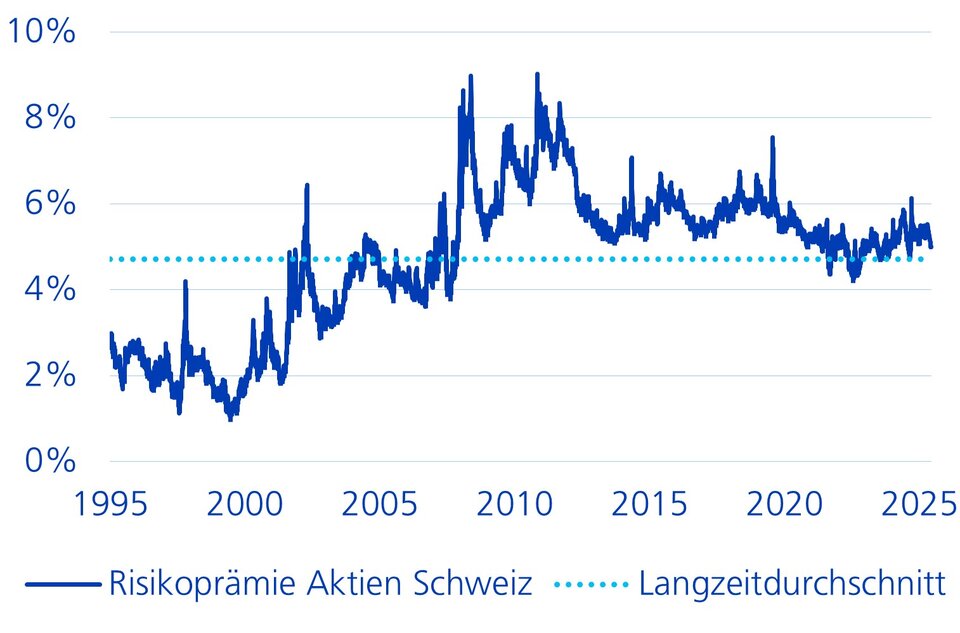 Im Tiefzinsumfeld können sich Unternehmen zu günstigeren Konditionen finanzieren, was sich positiv auf die Aktienkurse auswirkt. Zudem erhöhen tiefe Zinsen die Risikoprämie von Aktien im Vergleich zu Staatsanleihen. Diese Risikoprämie lag zum Jahresende bei 5 Prozent und damit über dem Langzeitdurchschnitt (vgl. Grafik). Daher könnten die anhaltend niedrigen Zinsen dem Schweizer Aktienmarkt auch 2026 Rückenwind verleihen.