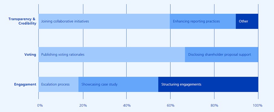2025 war bereits das zweite Jahr, in dem wir unsere systematischen Engagements mit Asset Managern weiter ausgebaut haben. Aktuell führen wir 18 laufende Engagements, die oft mehrere thematische Schwerpunkte abdecken. Dabei waren unsere Haupt-Engagement-Themen: Empfehlungen zum Beitritt zu kollaborativen Initiativen, die Veröffentlichung von Abstimmungsbegründungen (Voting Rationales) oder die Einführung klarer Eskalationsprozesse in ihren Engagement-Prozess. Die detaillierte Aufteilung ist in der Grafik unten ersichtlich. Unsere Themen leiten wir aus eigenen Bewertungsindikatoren ab und passen sie gezielt an die individuellen Bedürfnisse und Entwicklungsmöglichkeiten der jeweiligen Asset Manager an.