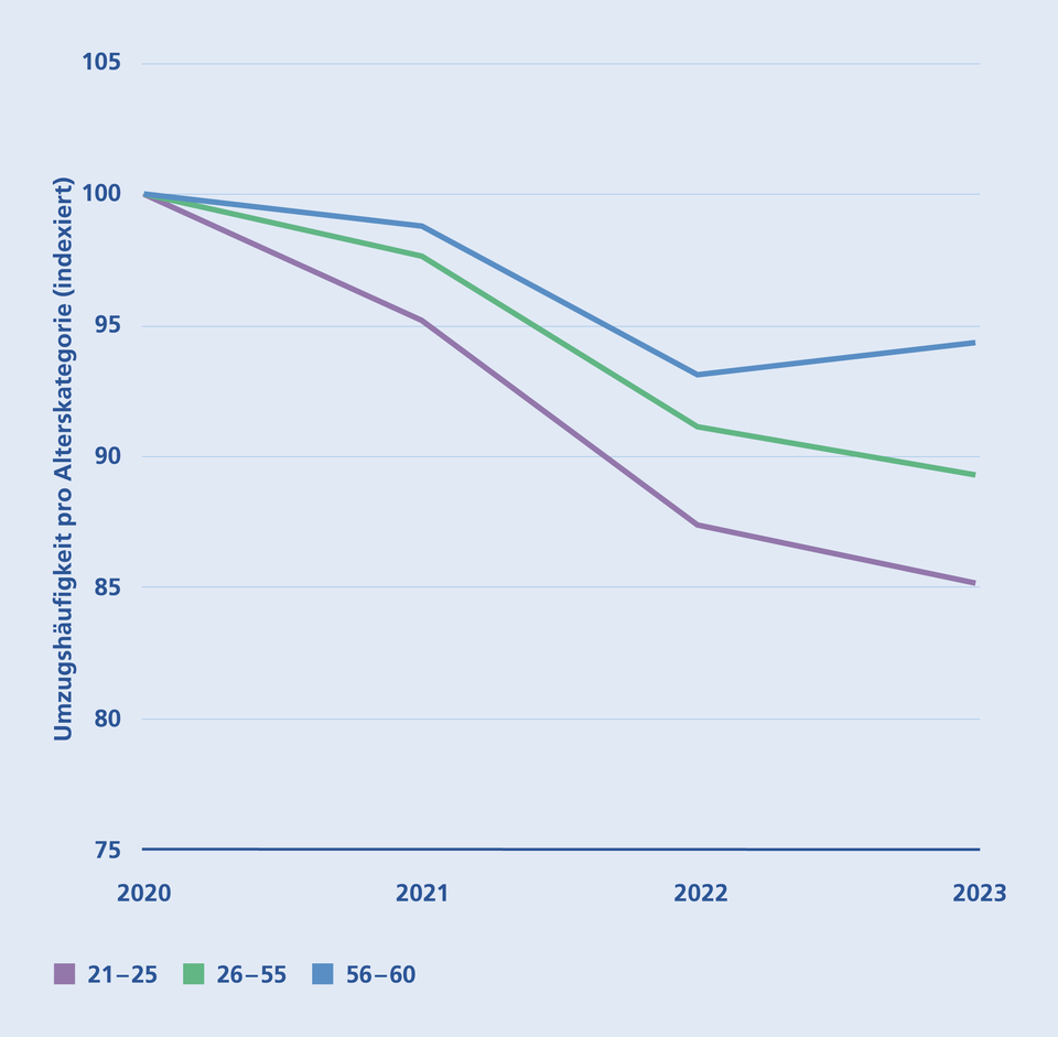 Veränderung der Umzugshäufigkeit der ständigen Wohnbevölkerung pro Alterskategorie und Jahr (indexiert, 2020 = 100)