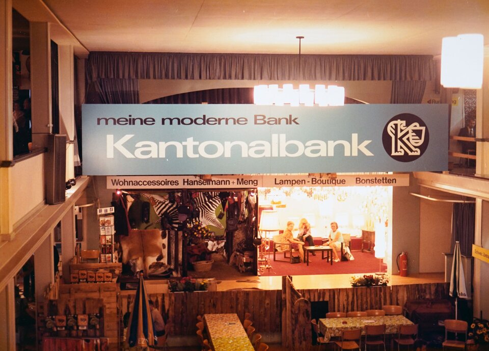 Bereits kurz nach ihrer Gründung beteiligte sich die Zürcher Kantonalbank an diversen kantonalen Gewerbemessen sowie an nationalen Landesausstellungen. Allerdings ging es dabei nicht um die Präsentation ihrer Finanzdienstleisungen, sondern um eine Leistungsschau der sogenannten «Gewerbehalle», die von der ZKB von 1877 bis 1934 als Showroom für Schreiner und andere Handwerker im Bereich Möbel und Innnendekoration betrieben wurde.
